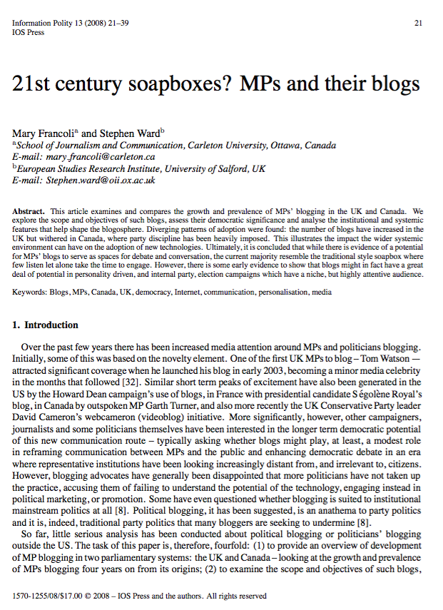 In 2007, Dr Mary Francoli, then Leverhulme Visiting Fellow in the New Political Communication Unit under a project grant won by Andrew Chadwick, and Stephen Ward, then of the Oxford Internet Institute, studied the development of MPs' blogging in the UK and Canada. The project traced the growth and prevalence of MPs' blogging, the scope and objectives of such blogs, and assessed their democratic significance. The comparative nature of the study helped to answer questions regarding institutional and systemic features which help shape the blogosphere. A combination of qualitative and quantitative methods were employed, including interviews with MPs in both Canada in the UK, content analysis of MPs’ blogs, as well as the use of domain statistics tools which helped identify the networks which include such blogs.